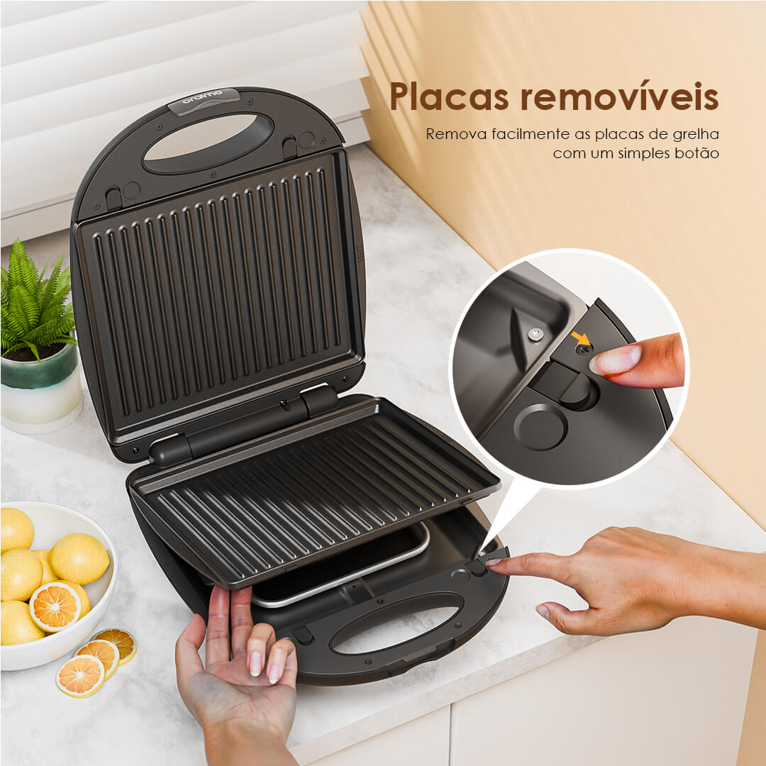 Alimentado por um elemento de aquecimento de 1200W, o aquecimento de duas faces garante um cozimento rápido e uniforme.