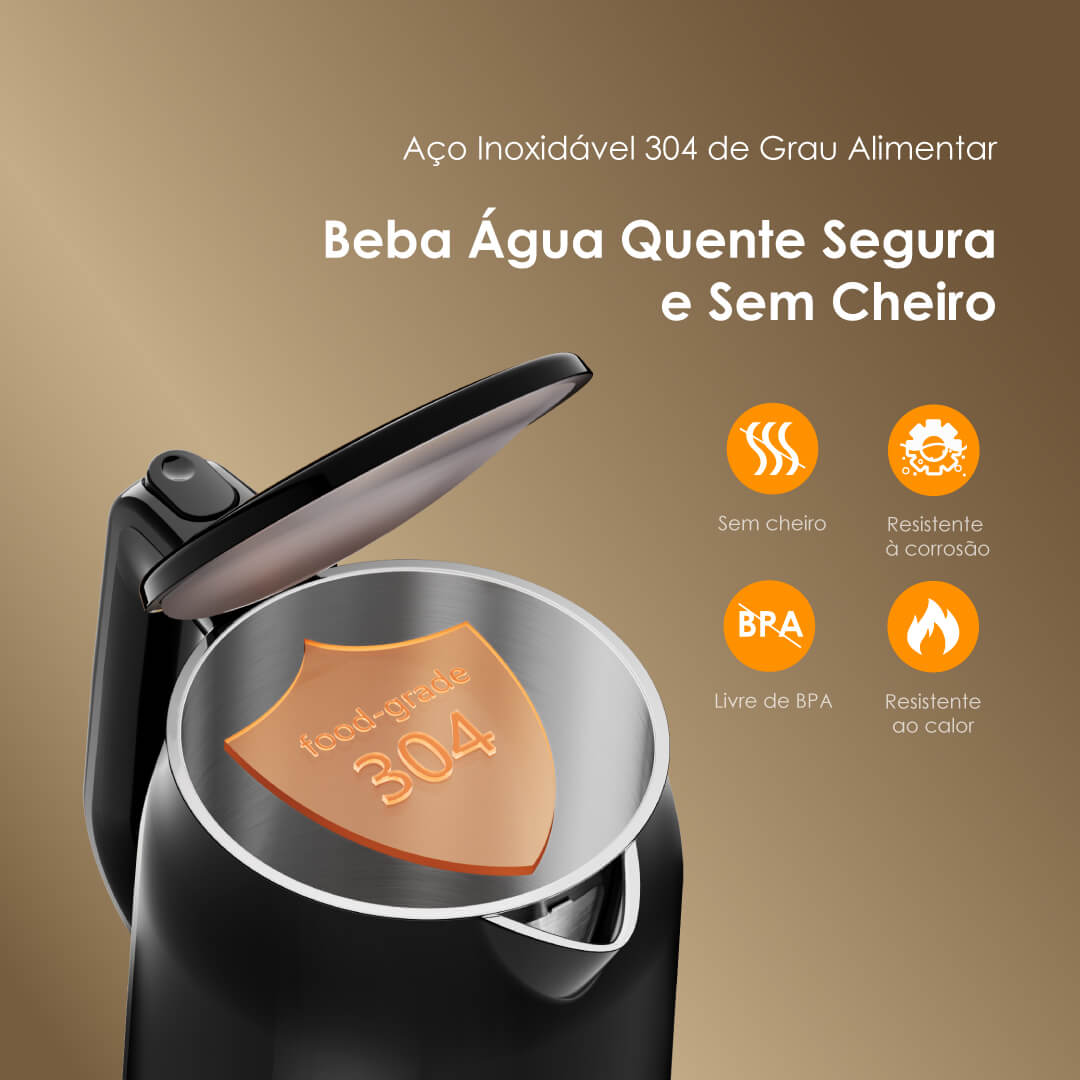 A parte interna da SmartKettle Byte é feita de aço inoxidável 304 de grau alimentar, que é livre de BPA, sem cheiro, resistente ao calor e à corrosão. Assim, a água é mais segura e mais fácil de limpar.