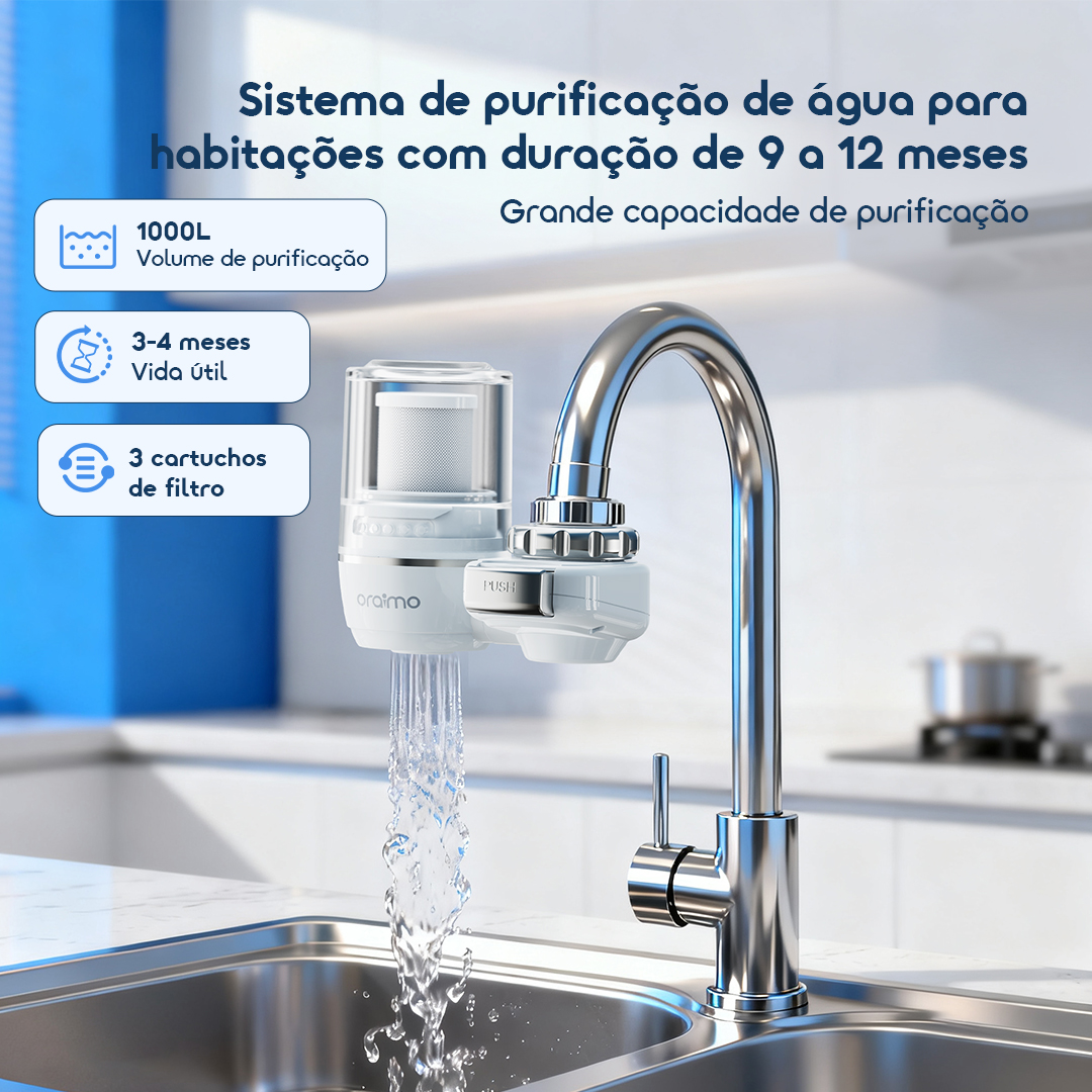 Com uma impressionante capacidade de purificação de até 1000L e uma vida útil de 3-4 meses por filtro, este sistema garante água limpa para sua família durante todo o ano. Acompanha 3 filtros substituíveis para uso prolongado.