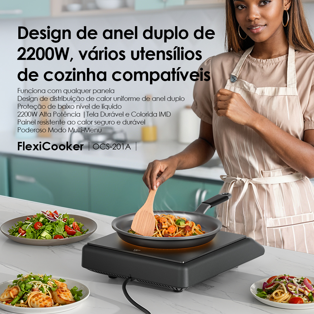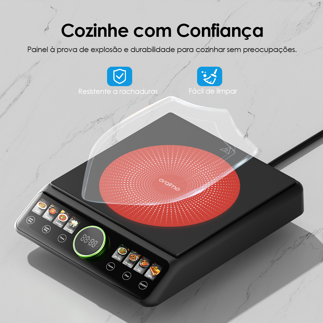 Compatibilidade universal, opções ilimitadas de culinária. O oraimo FlexiCooker é compatível com utensílios de aço inoxidável, ferro fundido, alumínio, cerâmica e vidro.