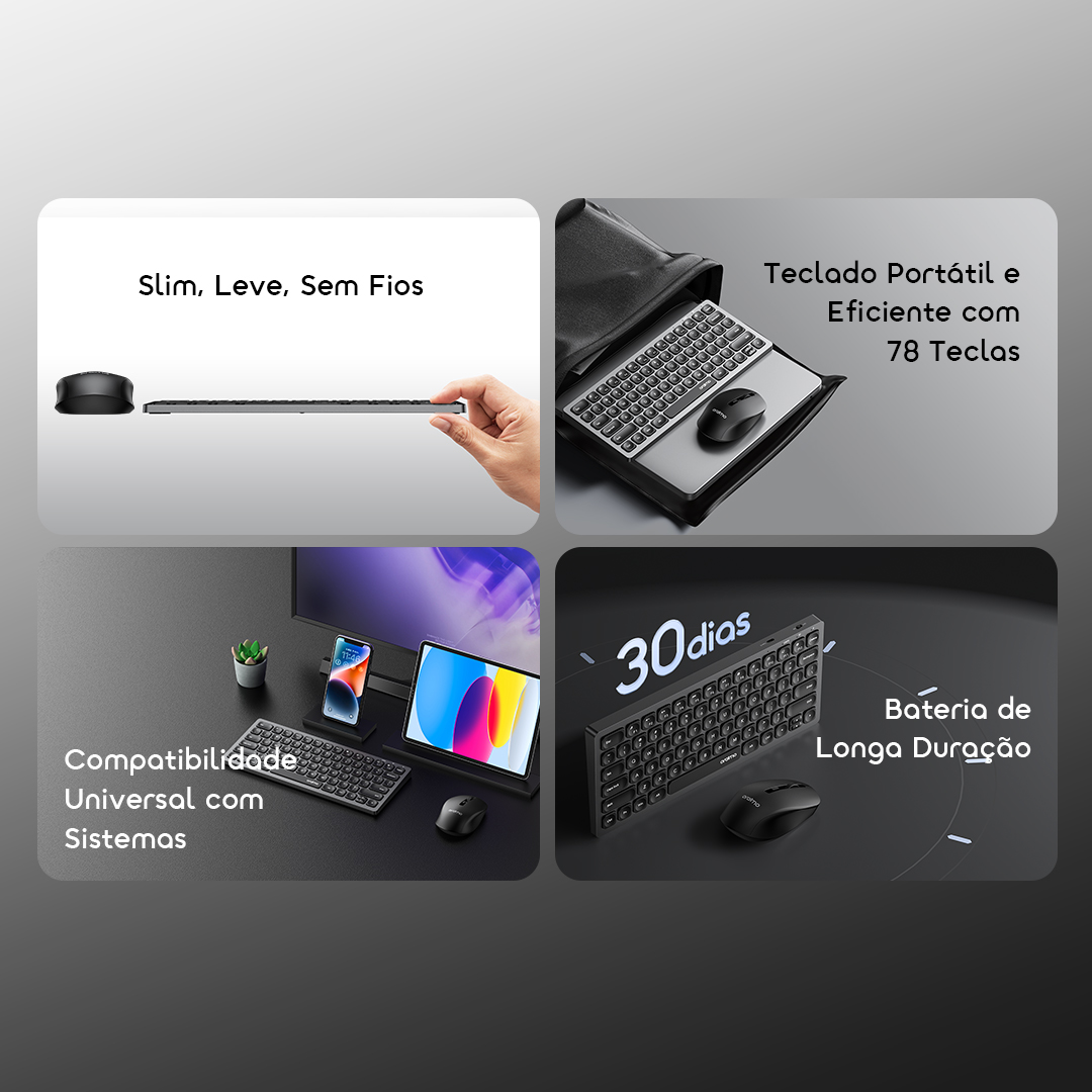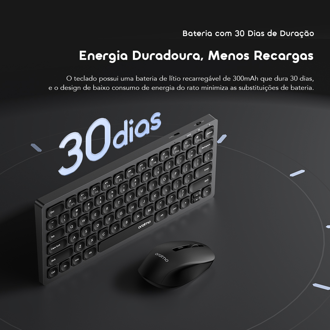 O teclado possui uma bateria de lítio recarregável de 300mAh que dura 30 dias, e o design de baixo consumo de energia do rato minimiza as substituições de bateria.