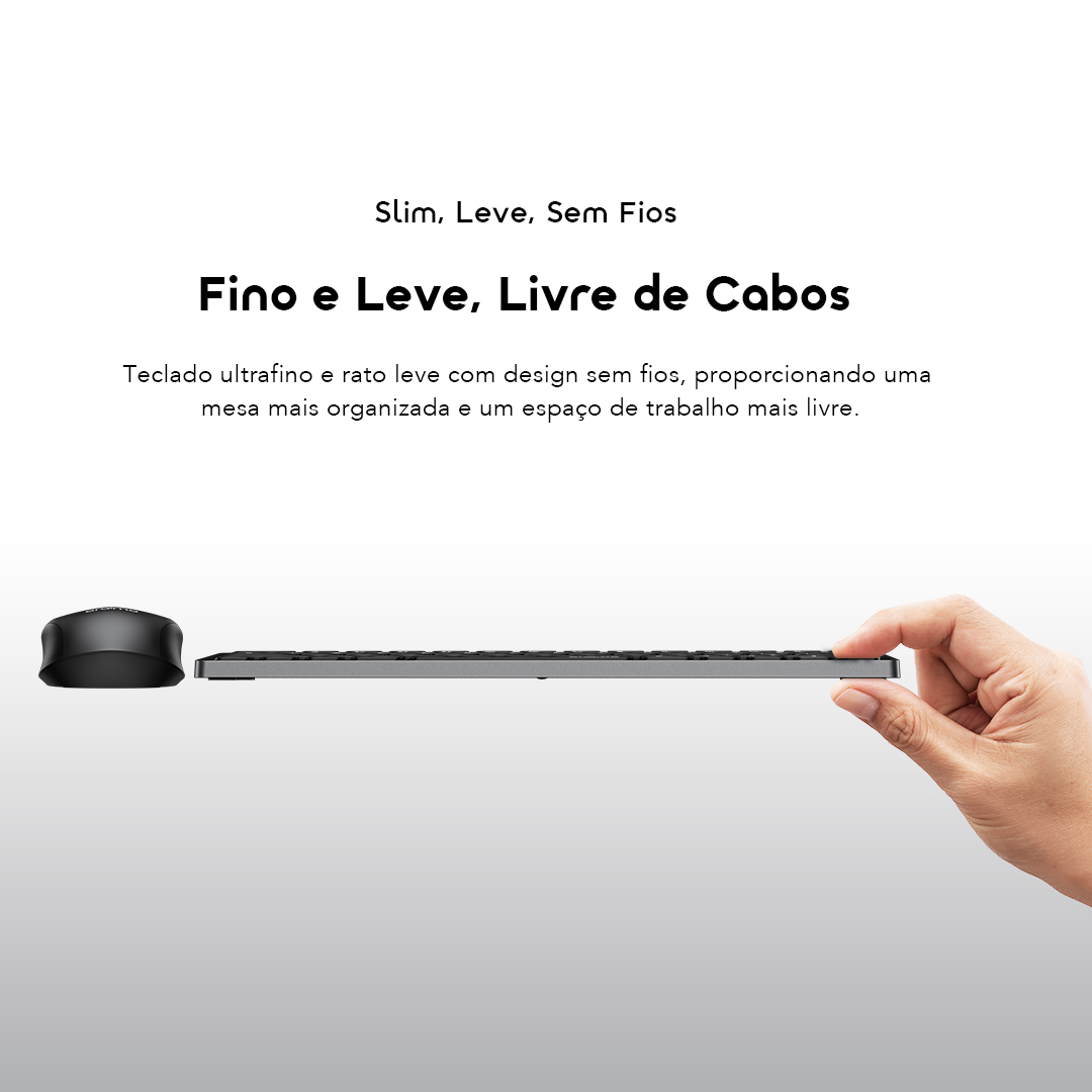 Teclado ultrafino e rato leve com design sem fios, proporcionando uma mesa mais organizada e um espaço de trabalho mais livre.