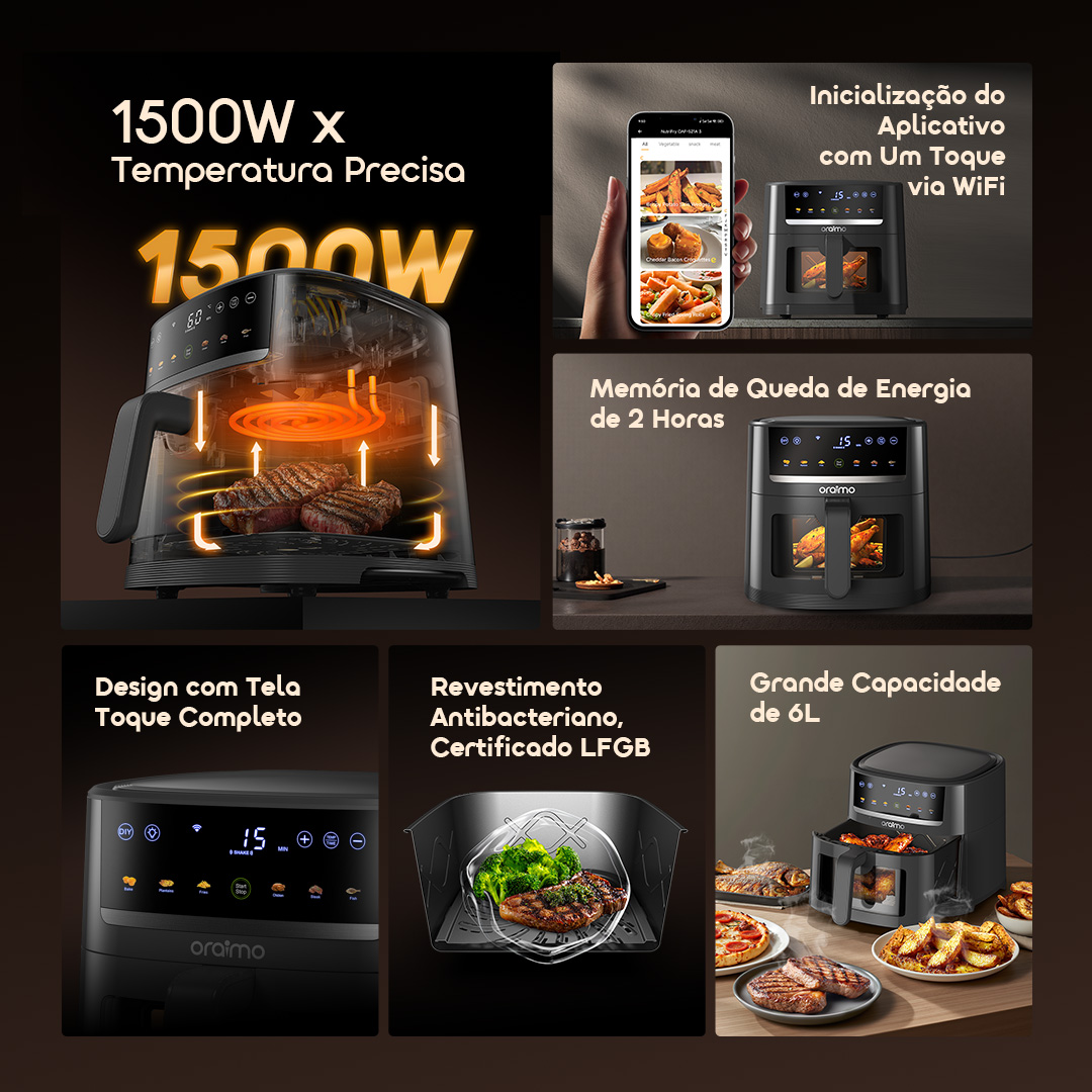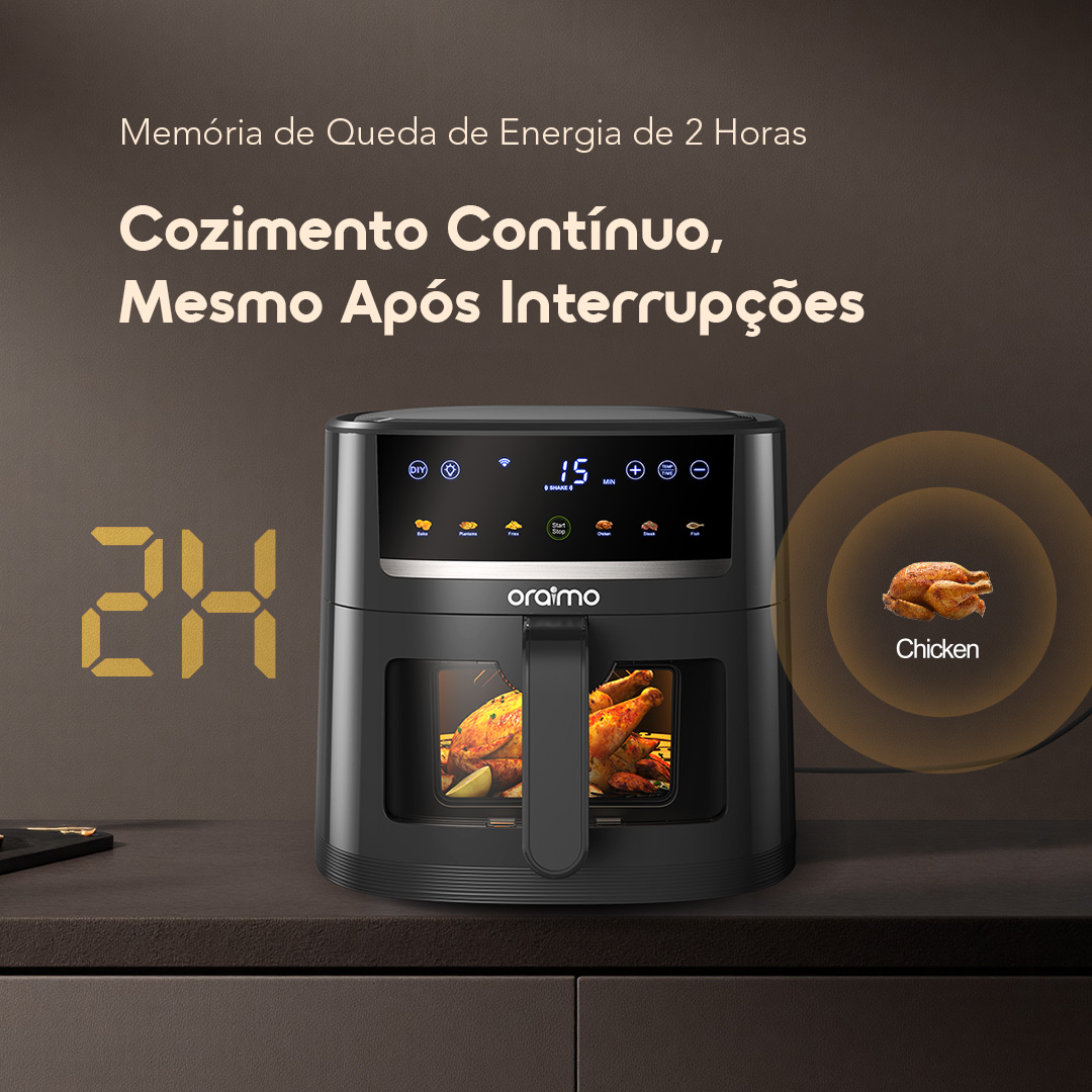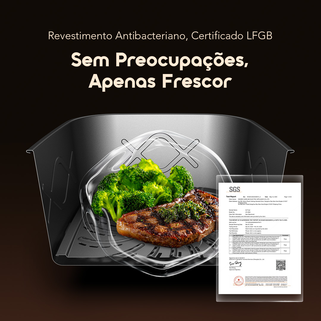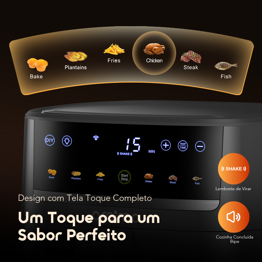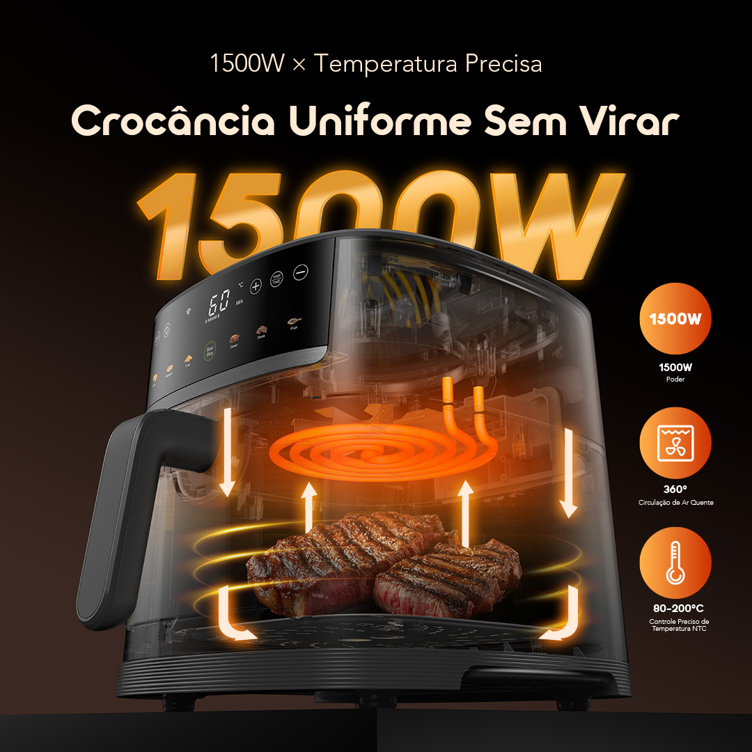 Controle preciso de 80–200°C combinado com circulação de ar quente 360° aprimorada—29,4% de fluxo de ar mais forte, 114% de cobertura mais ampla. Cozinhe de maneira uniforme, sem precisar virar. Perfeito para batatas fritas, frango, frutos do mar e muito mais.