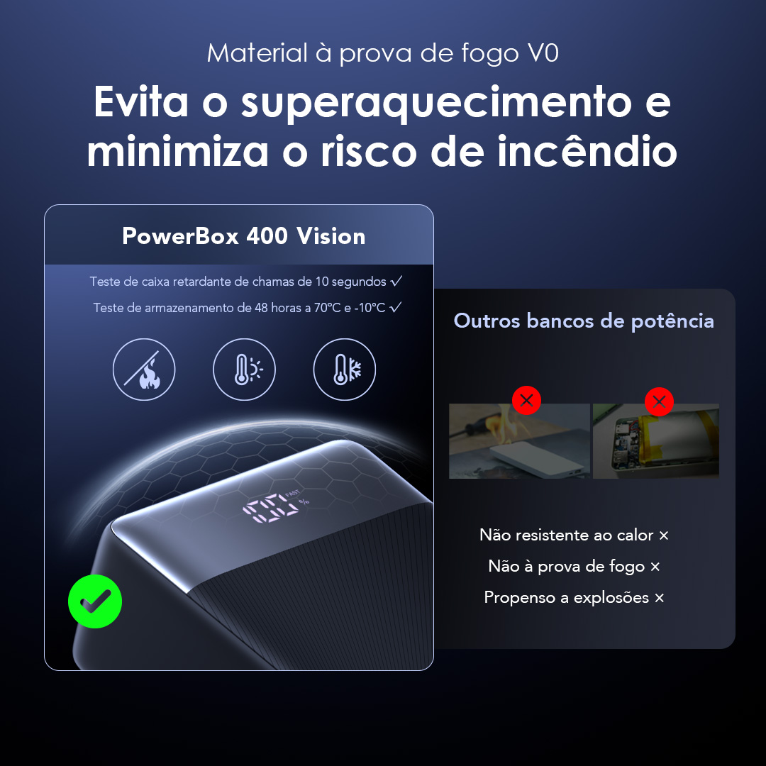 O material antifogo com classificação V0 oferece proteção excepcional contra altas temperaturas, explosões e chamas, garantindo a segurança do seu dispositivo em condições desafiadoras.