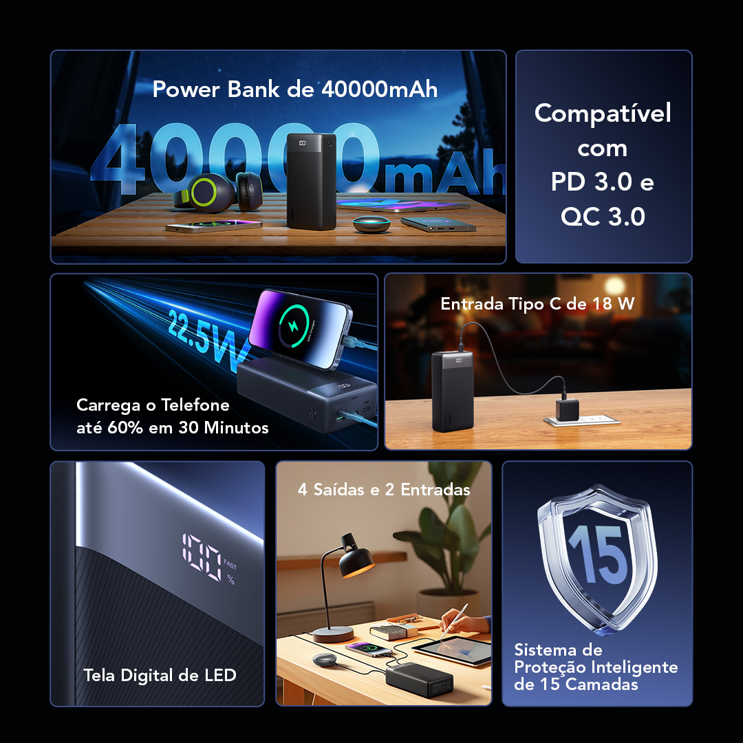 Com uma impressionante capacidade de 40,000mAh, este power bank pode carregar totalmente seu telefone até 8 vezes e fornecer energia prolongada para laptops, tablets e outros dispositivos de alta potência.