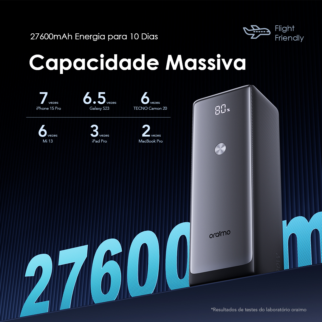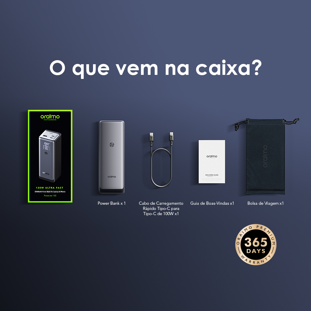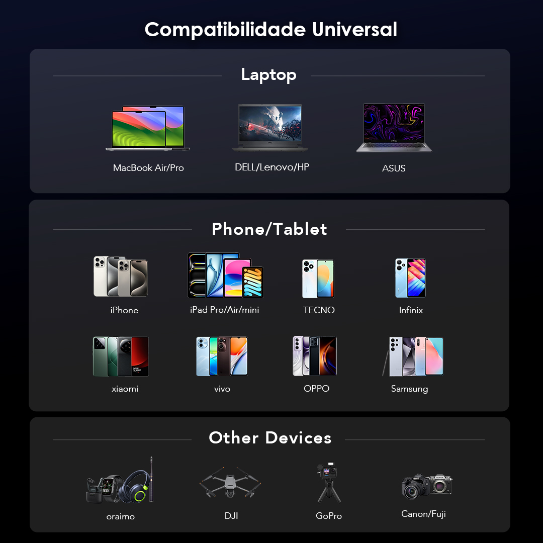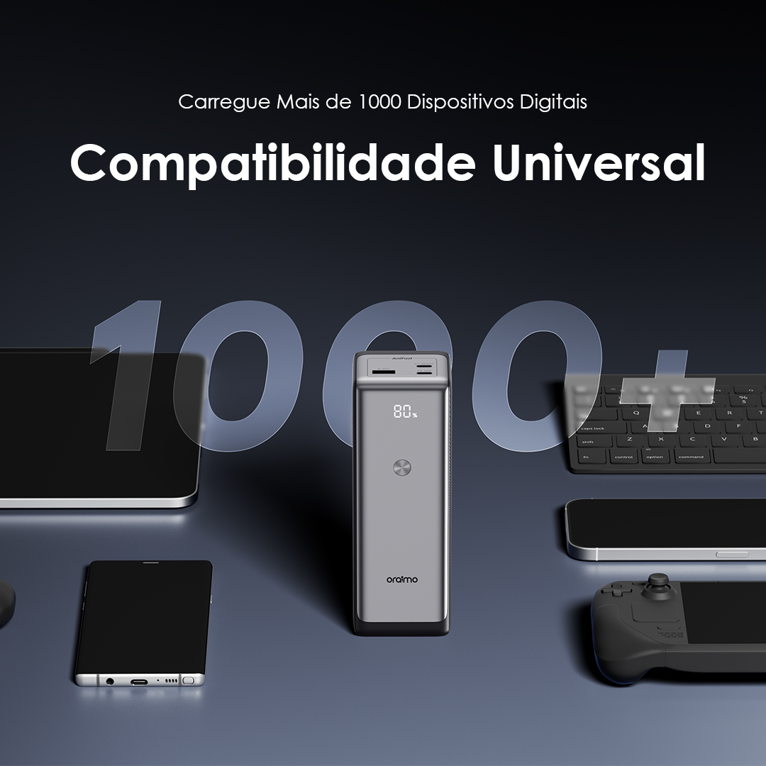*O PowerJet 130 da Oraimo é compatível com mais de 1.000 dispositivos principais, incluindo smartphones Apple, SAMSUNG, Tecno, Infinix e Mi, e laptops com porta Type-C, como MacBook Pro 13"/ MacBook Pro 14" / MacBook Pro 15"/MacBook Pro 16"/MacBook Air Series; HP Spectre/ Zbook; Google Pixelbook; Dell/Google Pixelbook/Microsoft Surface Book/ThinkPad e mais.