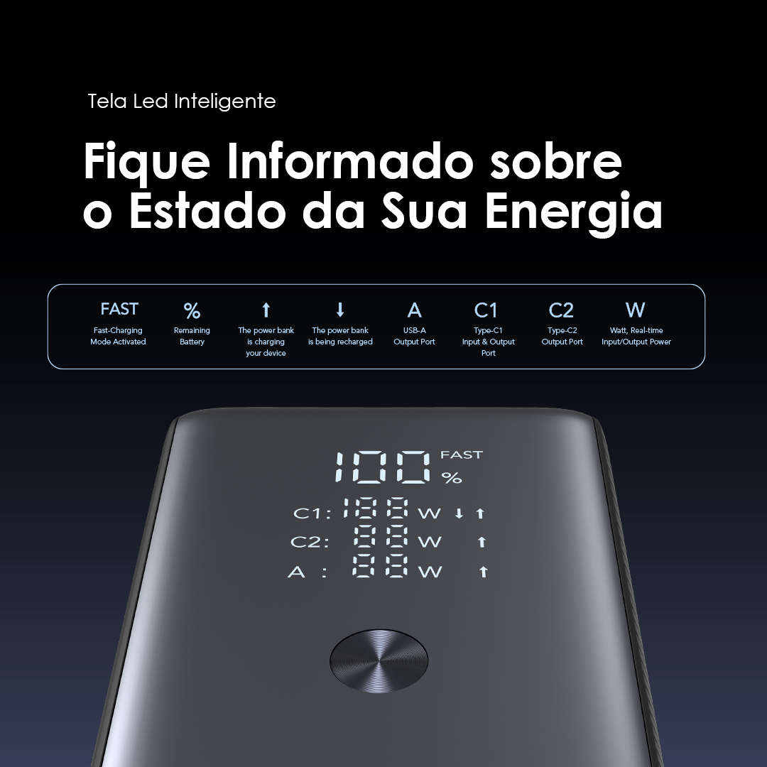 A tela LED inteligente permite que você verifique o nível de carga, o modo de carregamento atual e a eficiência do carregamento.