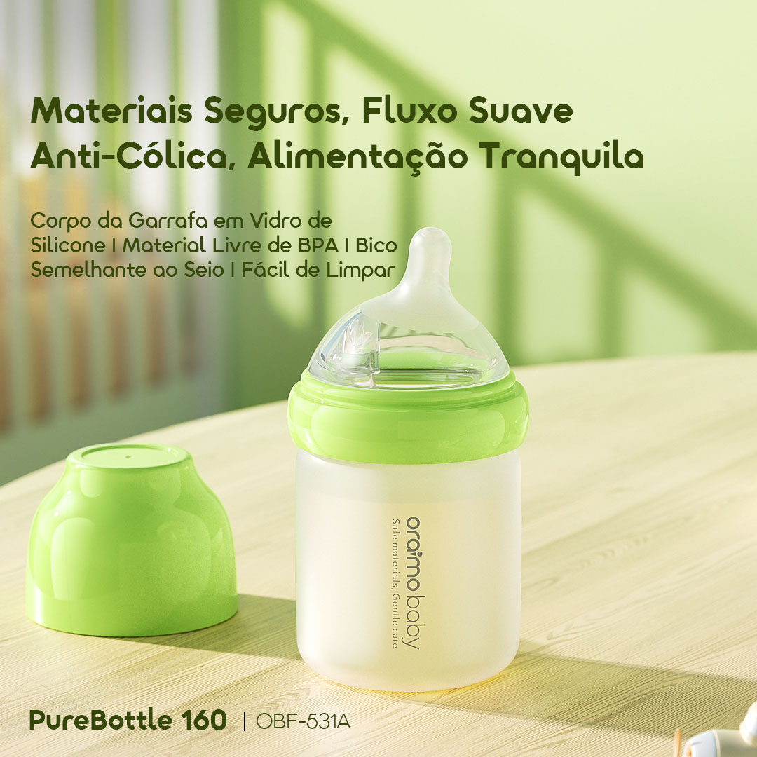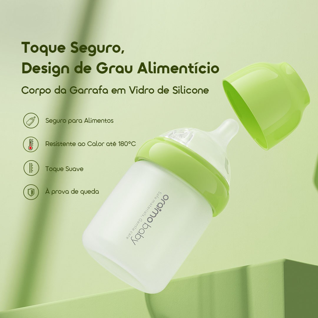 Construção totalmente de grau alimentício — vidro por dentro, silicone por fora. Resistente ao calor, resistente a quedas, super seguro.