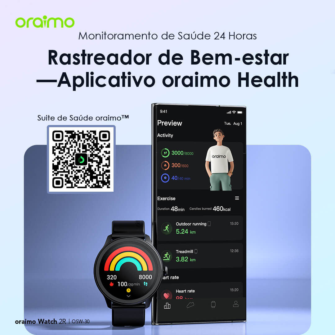 O oraimo Watch suporta monitoramento próprio da Frequência cardíaca, Saturação de oxigênio no sangue, Sono e Exercícios respiratórios. Baixe o aplicativo oraimo Health para monitoramento contínuo da saúde e bem-estar.