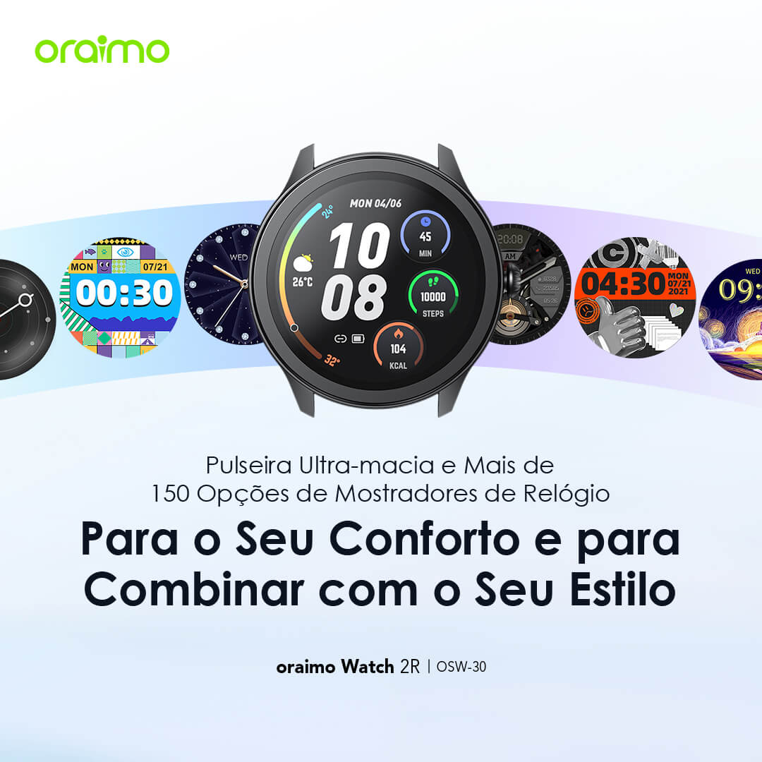 O relógio vem equipado com uma pulseira de silicone ultra-macia e destacável de 22mm. Além disso, o aplicativo oraimo Health oferece mais de 150 tipos de mostradores de relógio, que também podem ser personalizados para exibir uma foto única do seu álbum.