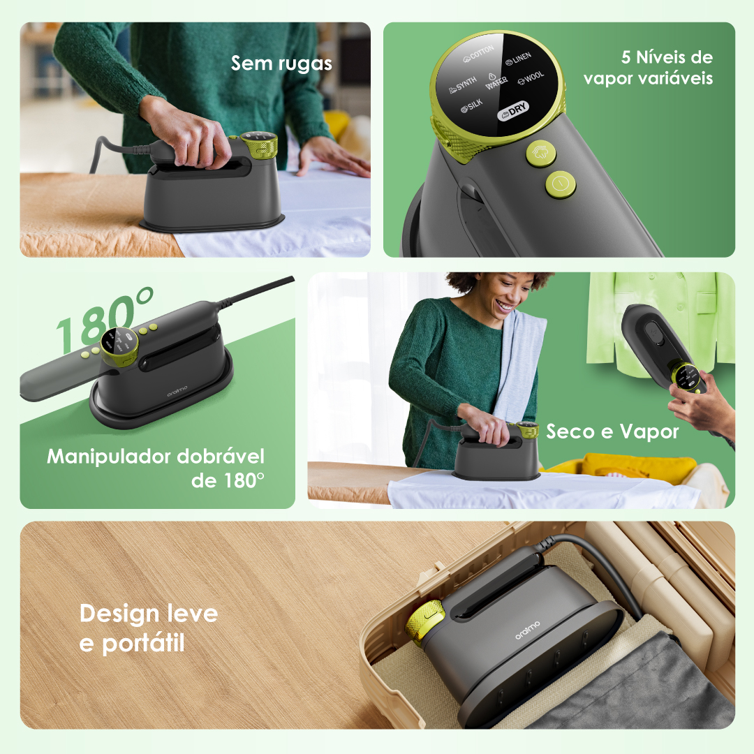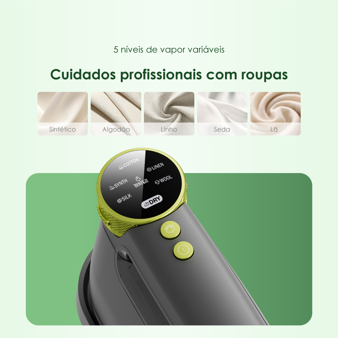 A ferro elétrico oraimo oferece 6 configurações de vapor específicas para diferentes tecidos: algodão, sintético, linho, seda e lã, fornecendo cuidado profissional para suas roupas.
