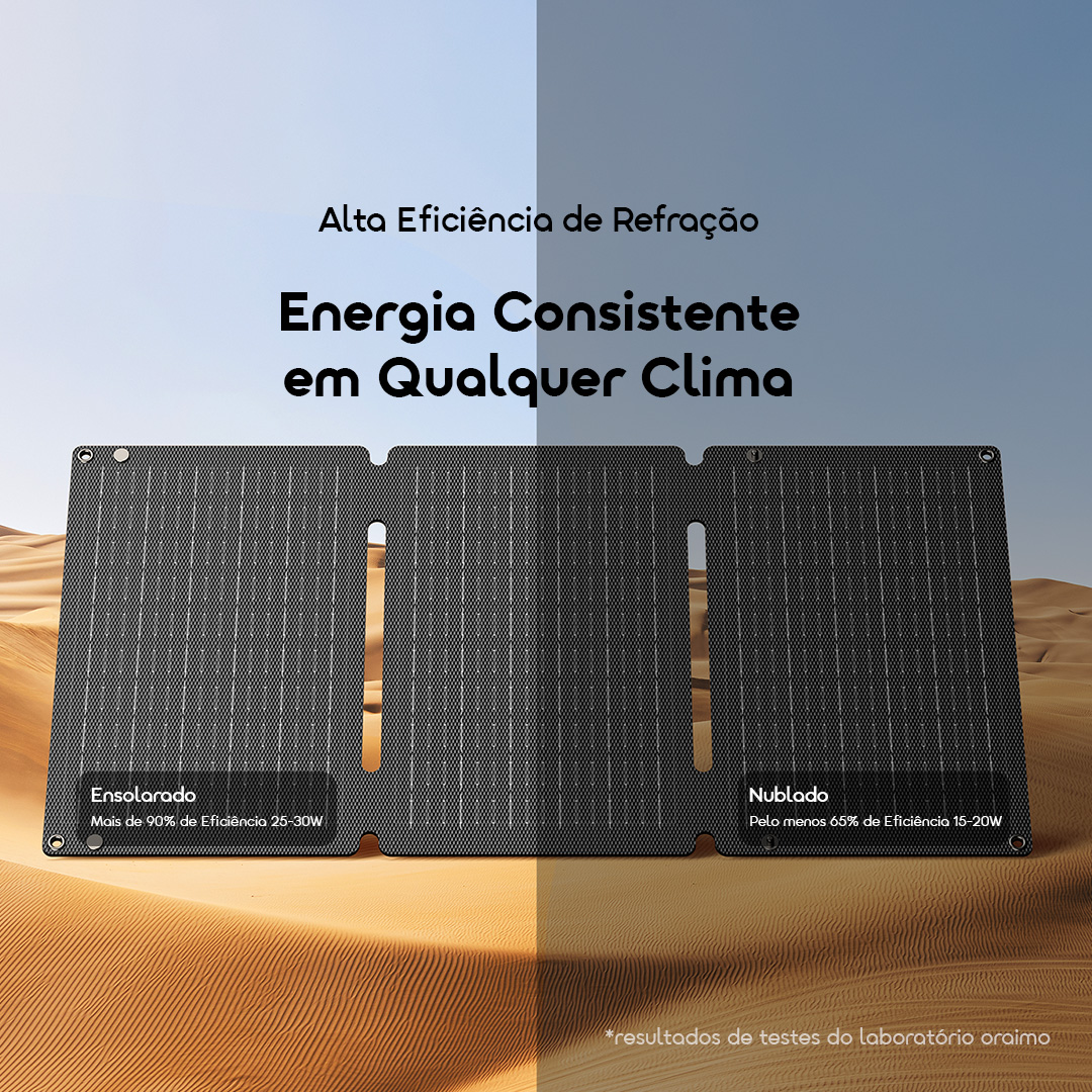 Pesando apenas 0,78kg, este carregador solar dobrável cabe facilmente na sua mochila e pode ser carregado com uma mão.