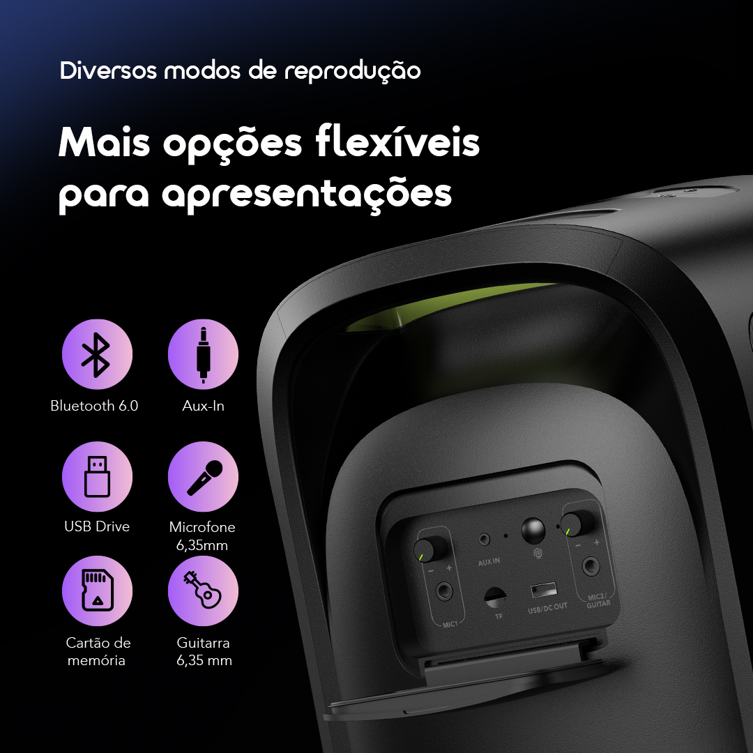 O SpaceBox Max oferece não apenas vários modos de reprodução de áudio, como Bluetooth, Aux-in, cartão de memória e USB, mas também entradas de microfone e guitarra de 6,35mm para apresentações ao vivo.