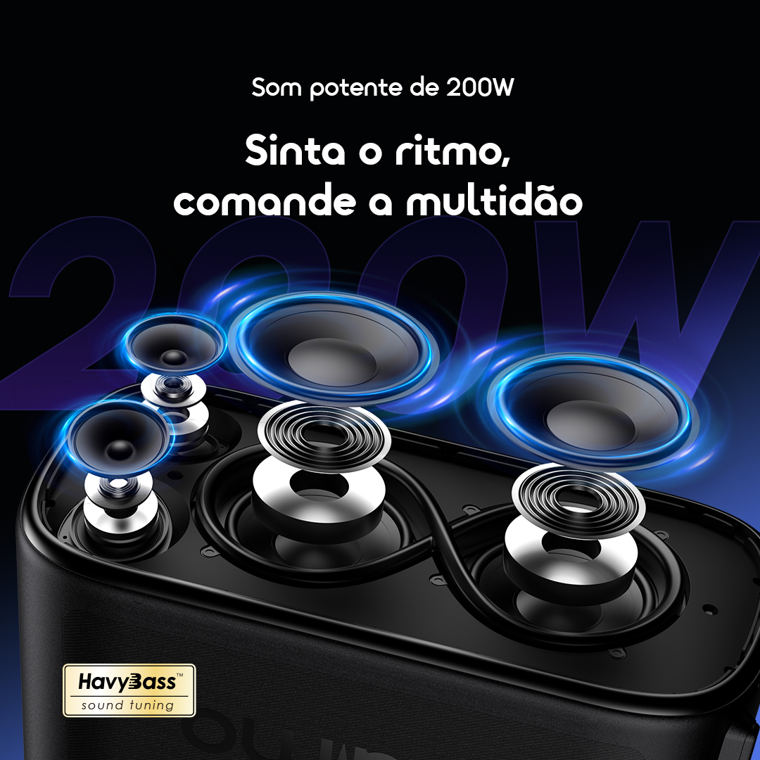 Os dois subwoofers de 6,5 polegadas e tweeters de 2,25 polegadas do SpaceBox Max, ajustados pela exclusiva HavyBass™, oferecem graves que fazem o chão tremer e agudos encorpados acima dos gritos da multidão. Sinta o ritmo envolver seu corpo, ouça cada detalhe — este é o som que controla a multidão.