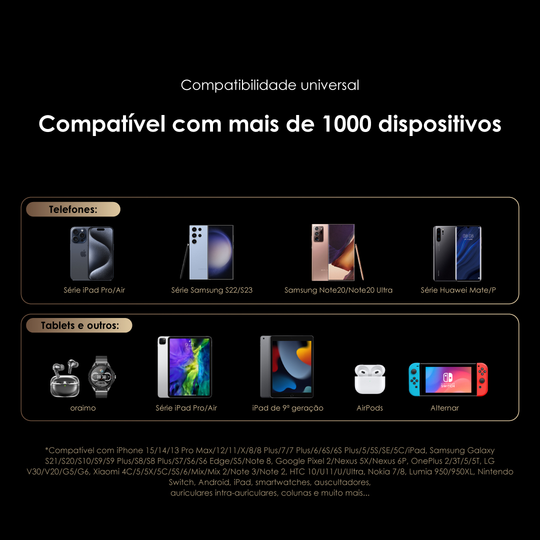 *Compatível com iPhone 15/14/13 Pro Max/12/11/X/8/8 Plus/7/7 Plus/6/6S/6S Plus/5/5S/SE/5C/iPad, Samsung Galaxy S21/S20/S10/S9/S9 Plus/S8/S8 Plus/S7/S6/S6 Edge/S5/Note 8, Google Pixel 2/Nexus 5X/Nexus 6P, Oneplus 2/3T/5/5T, LG V30/V20/G5/G6, Xiaomi 4C/5/5X/5C/5S/6/Mix/Mix 2/Note 3/Note 2, HTC 10/U11/ U/Ultra, Nokia 7/8, Lumia 950/950XL, Nintendo Switch, Android, iPad Tablet, smartwatches, headphones, earphones, speakers e muito mais...