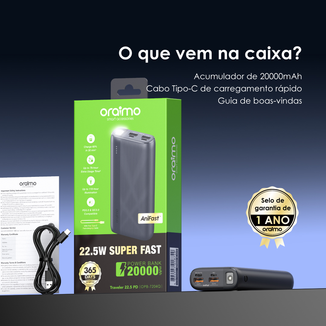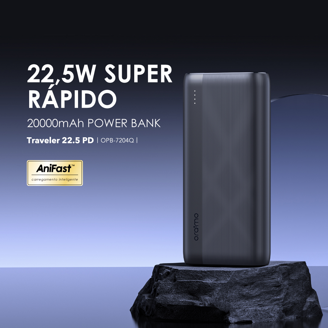 O power bank de 20000 mAh possui uma taxa de carregamento de até 22.5W, ajudando a carregar seu telefone até 60% em 30 minutos e permitindo que ele volte à ação com tempo mínimo de inatividade.