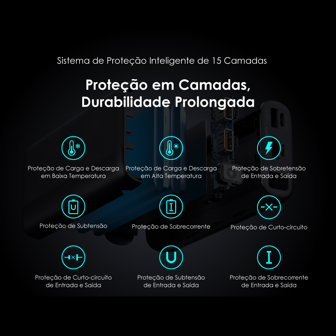Equipado com um recurso de segurança abrangente, garantindo que seus dispositivos estarão protegidos contra danos, sendo carregados de forma rápida e segura.