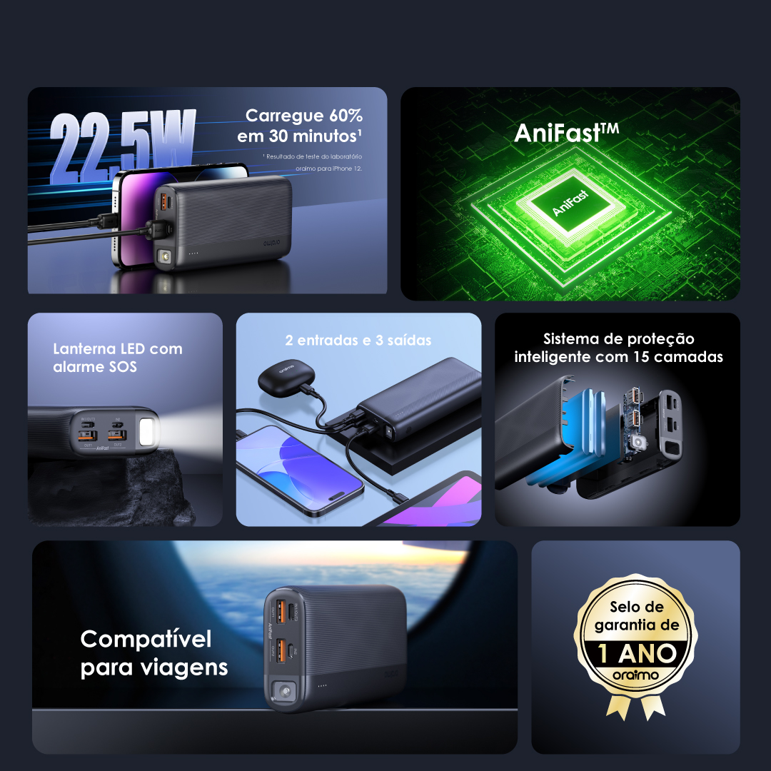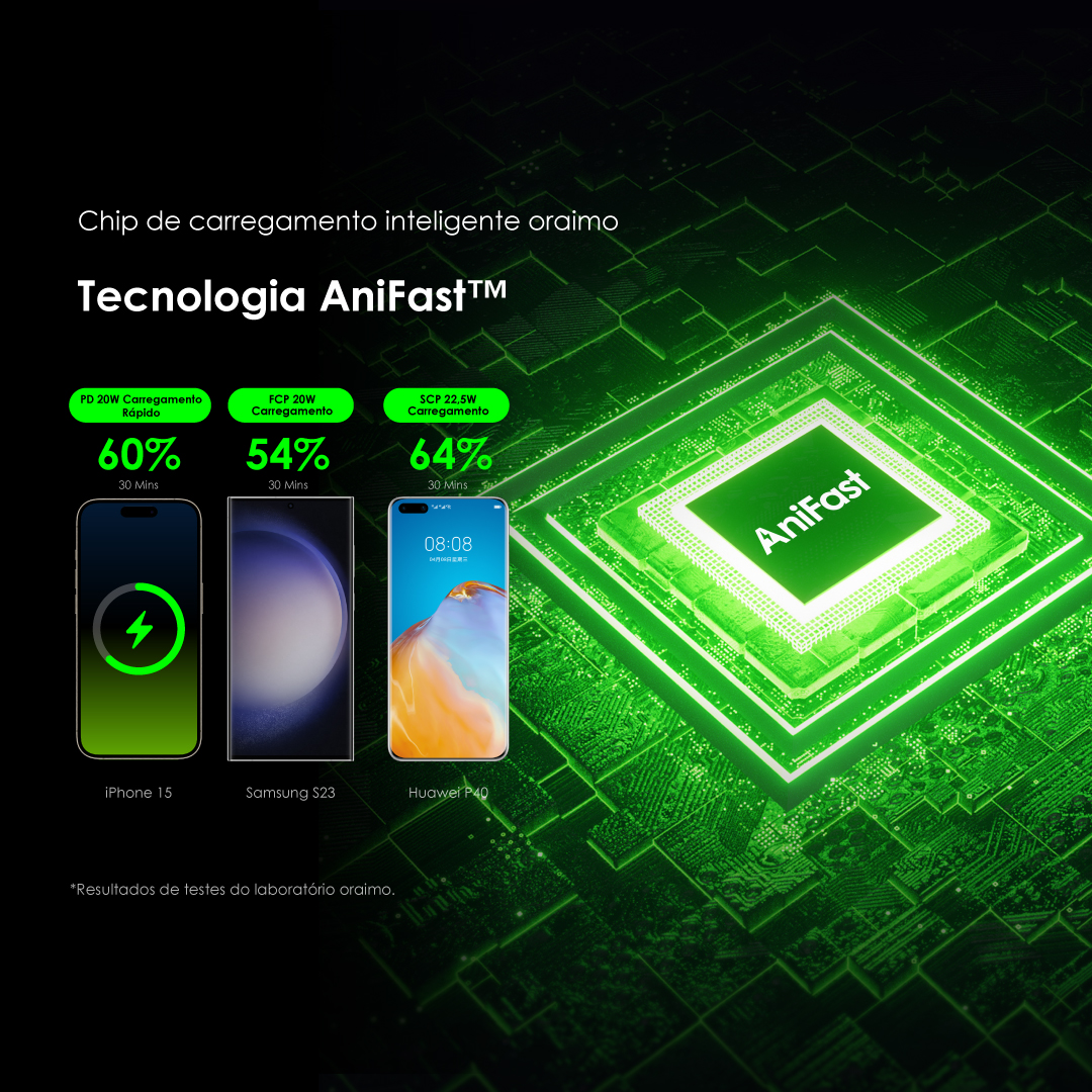 Com a tecnologia exclusiva de energia inteligente da oraimo - AniFastTM, o power bank identifica inteligentemente o protocolo de carregamento rápido do seu dispositivo para fornecer a carga mais rápida possível.