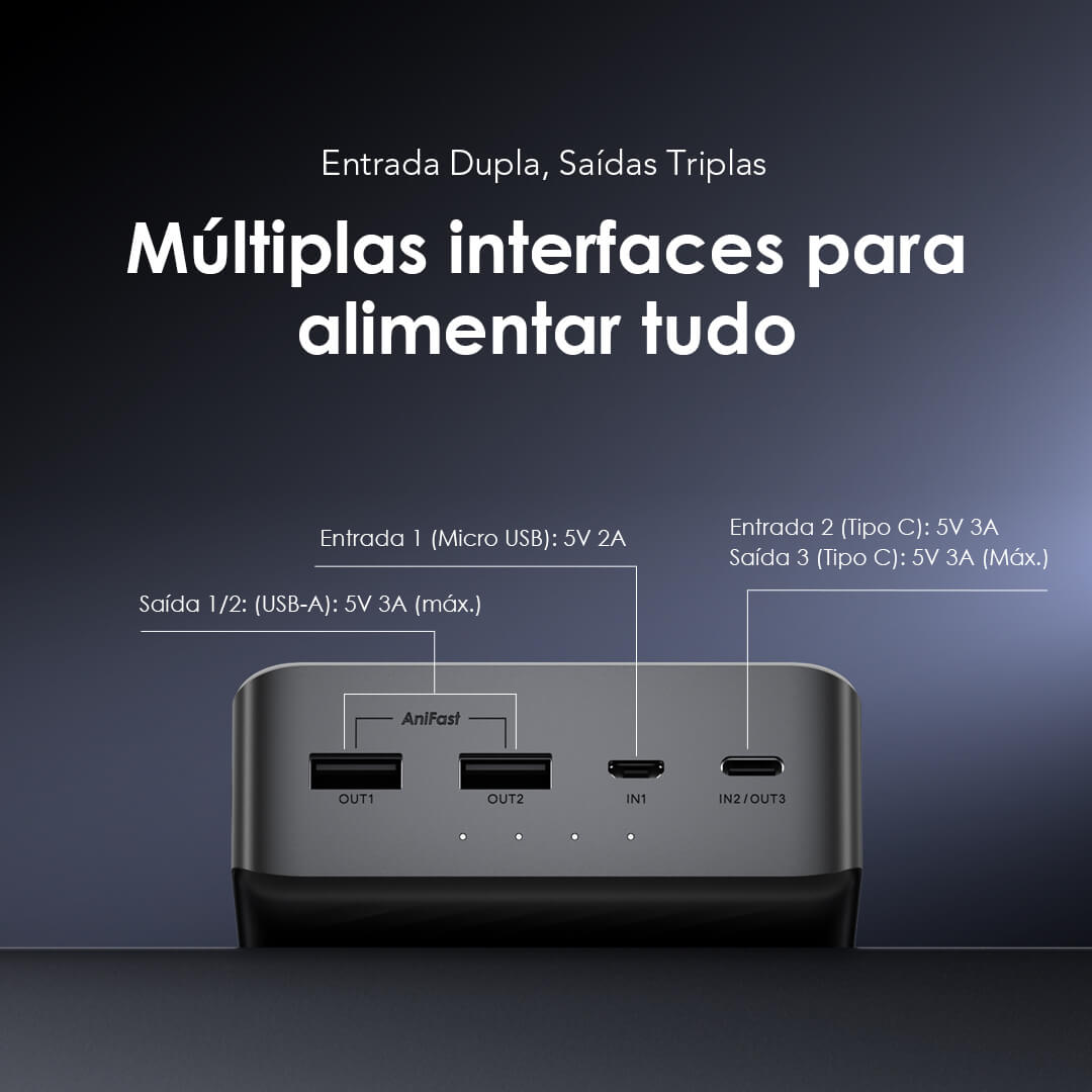 Uma única interface Type-C fornece uma solução para carregar dispositivos e carregar a própria banca de energia.