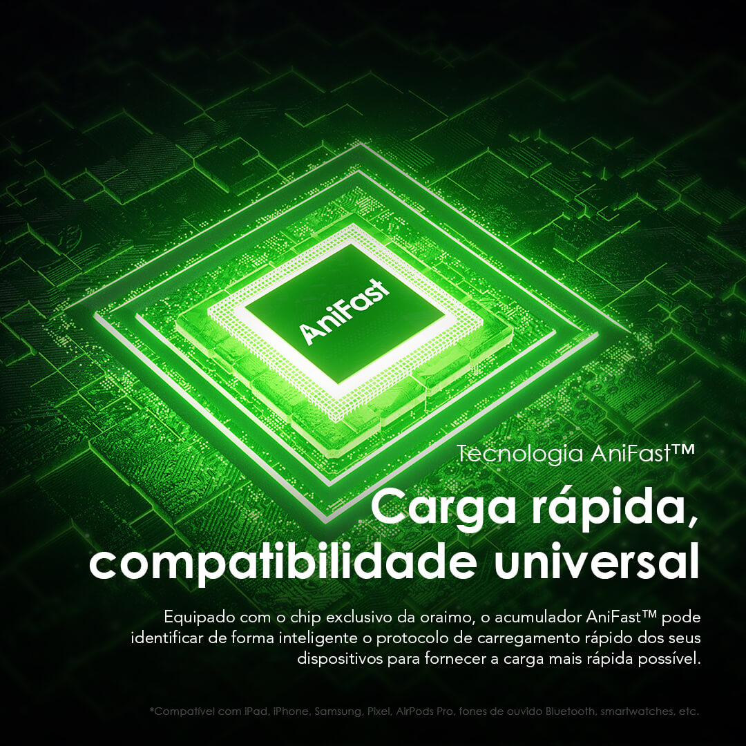 Equipado com o chip exclusivo da oraimo, a banca de energia AniFast™ pode identificar inteligentemente o protocolo de carregamento rápido de seus dispositivos para fornecer a carga mais rápida possível.*Compatível com iPad, iPhone, Samsung, Pixel, AirPods Pro, headsets Bluetooth, relógios inteligentes, etc.