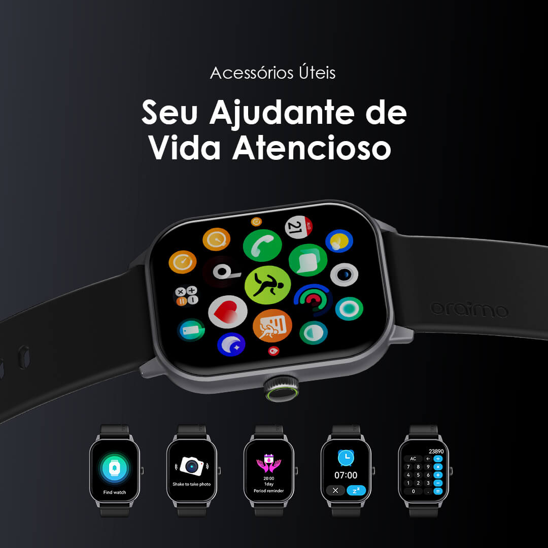 Pressione o botão Início do relógio para descobrir mais acessórios úteis para a vida cotidiana, como câmera remota, despertador, cronômetro, temporizador, calculadora, lanterna, localizar meu telefone, controle de música, etc.