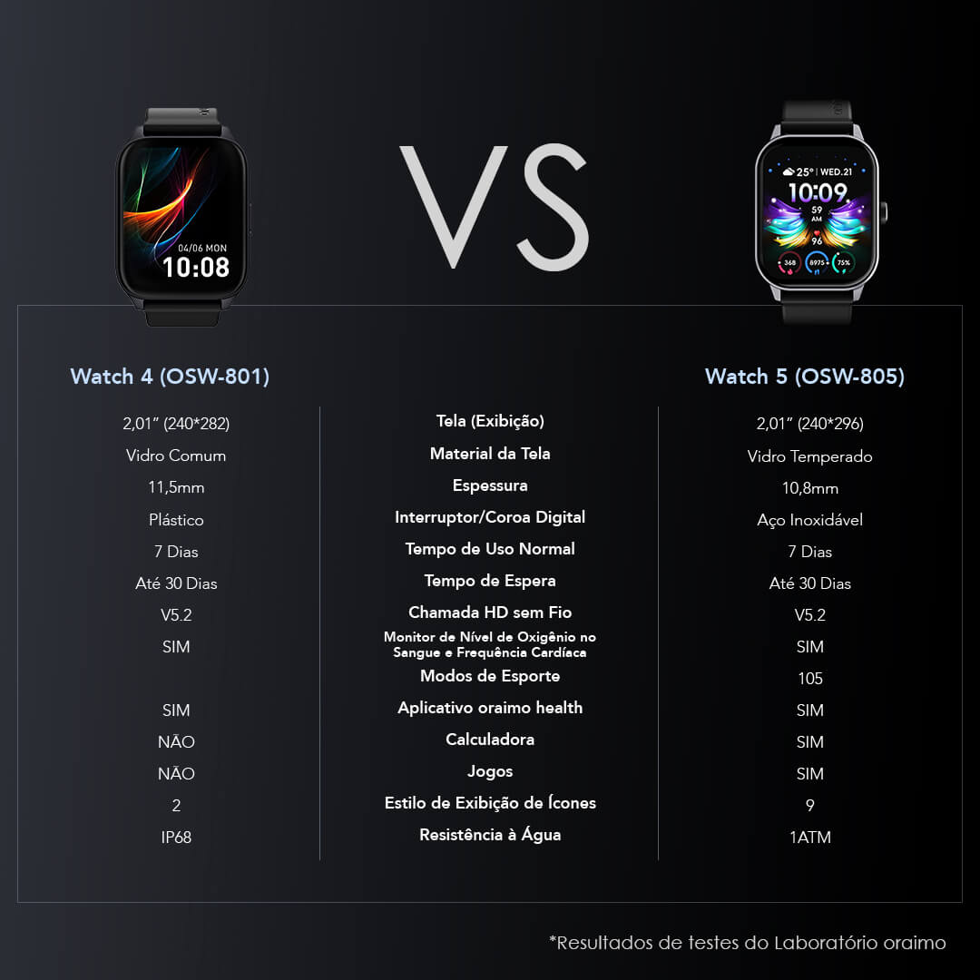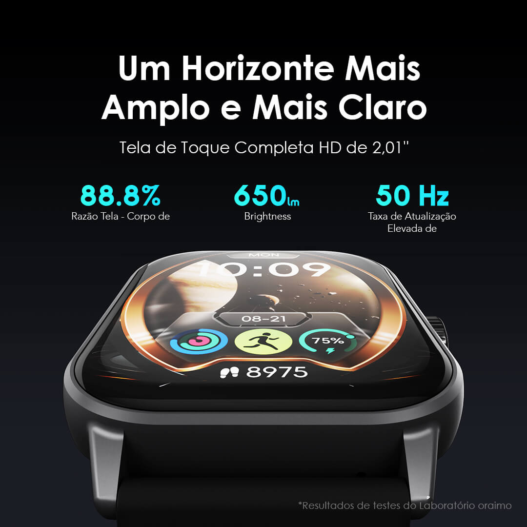 Funções Principais: contagem de passos, chamada via Bluetooth, batimento cardíaco, oxigênio no sangue