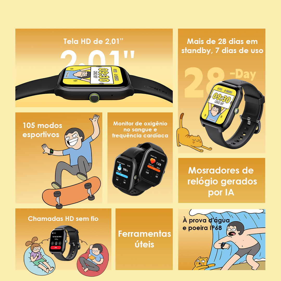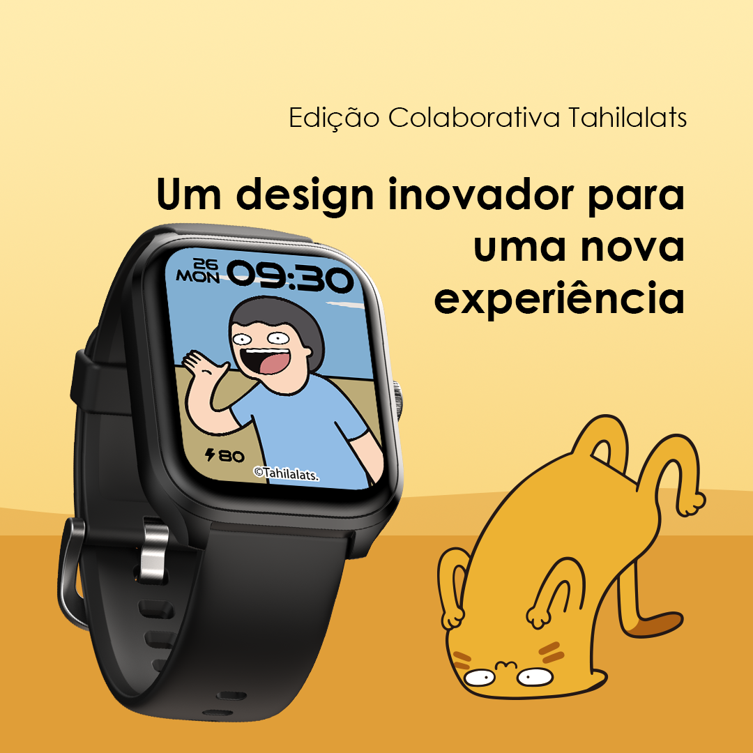 Adicione humor à sua rotina com a exclusiva coleção de mostradores Tahilalats. O smartwatch oraimo se une ao icônico webcomic indonésio Tahilalats, trazendo personagens engraçados e cenas espirituosas à vida por meio de mostradores personalizados.