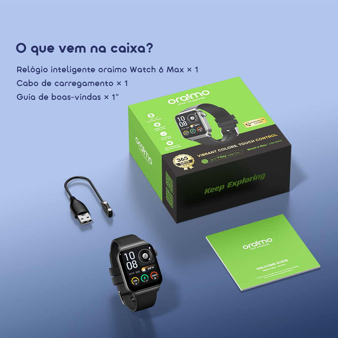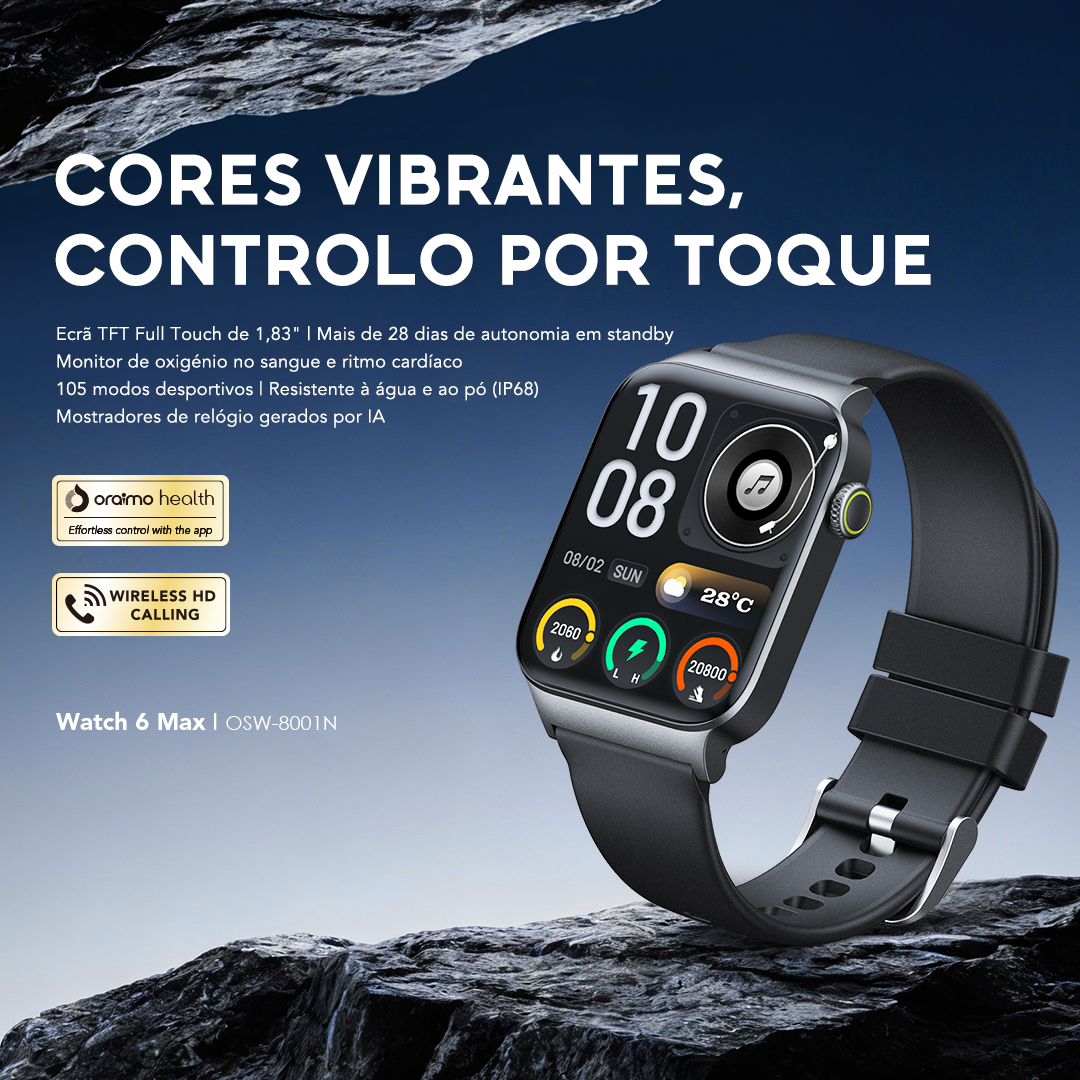 oraimo watch 6 max Relógio inteligente com ecrã tátil de 1,83 polegadas e bateria com duração de 28 dias