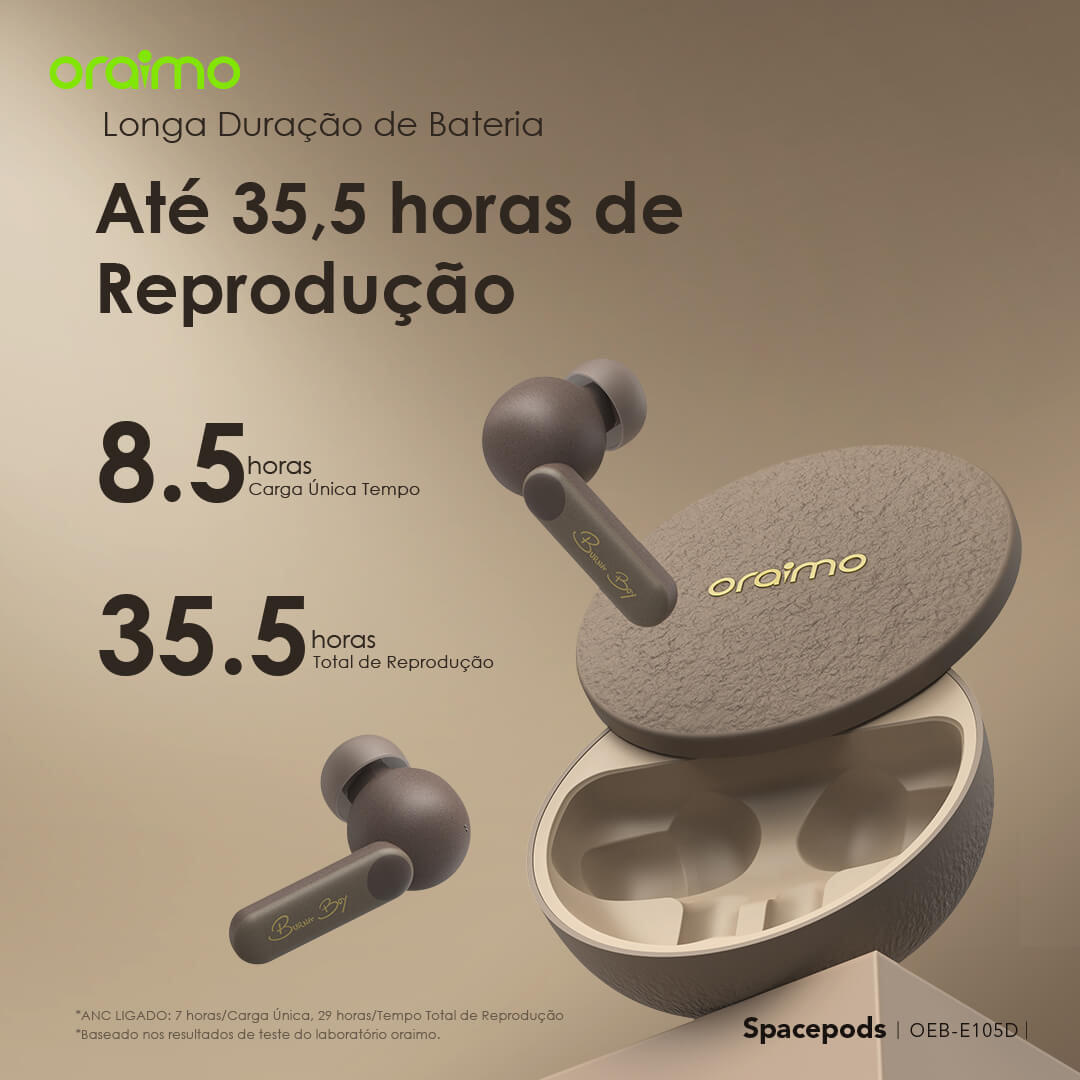 Os oraimo SpacePods oferecem 8,5 horas de autonomia após uma carga completa, com o estojo de carregamento fornecendo 27 horas adicionais para mantê-lo ativo durante os dias. Uma carga rápida de 10 minutos proporciona até 170 minutos de vida útil da bateria.