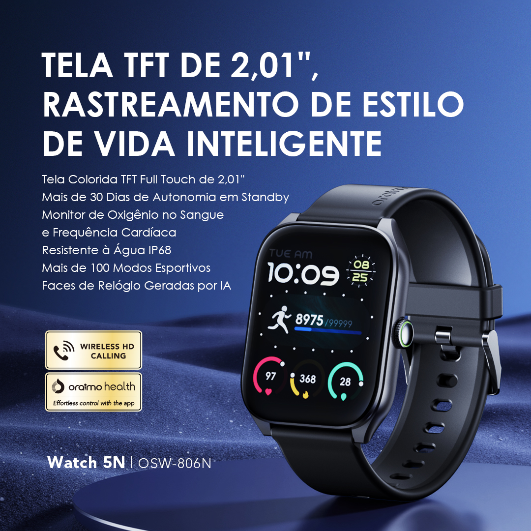 O Relógio 5N possui monitoramento de saúde para frequência cardíaca, oxigênio no sangue, estresse, sono, saúde feminina, fornecendo a tranquilidade e a motivação necessárias para manter a saúde diariamente.