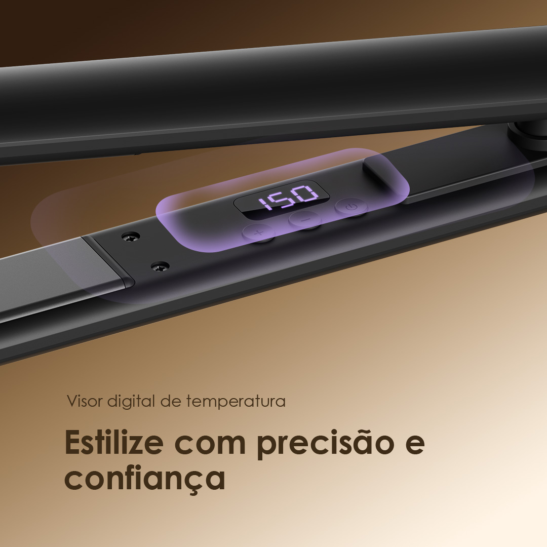 Controle preciso de temperatura através do display digital, evitando danos ao cabelo por calor excessivo e garantindo o melhor resultado sem dificuldades com baixa temperatura.